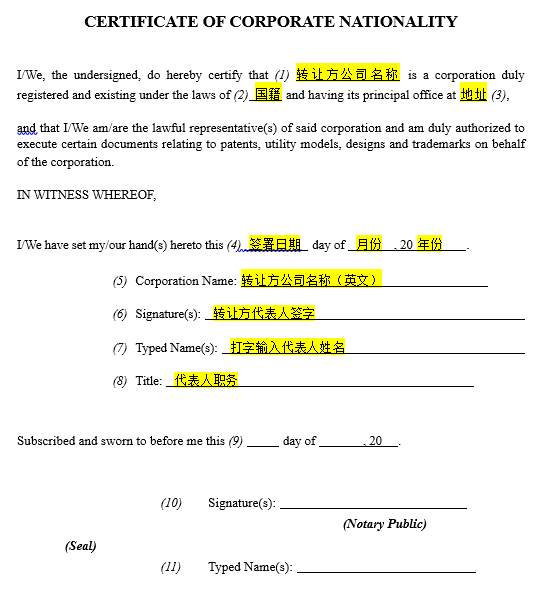 (2)韩国专利办理转让需要注意,转让方需要签署《企业国籍证明》并且到公证处进行公证,可能还会要求对转让证明进行公证;还需注意转让证明签字人必须与企业国籍证明签字人保持一致。目前根据我们的实务经验,公证处可能会要求提供韩国专利的受理通知书或专利证书的复印件,并且要求提供英文翻译件。由于各地公证处的公证要求各不相同,建议在进行公证前先咨询当地的公证处。
