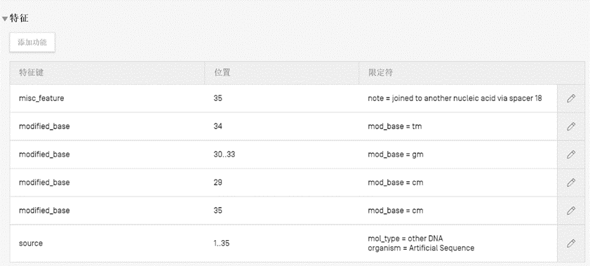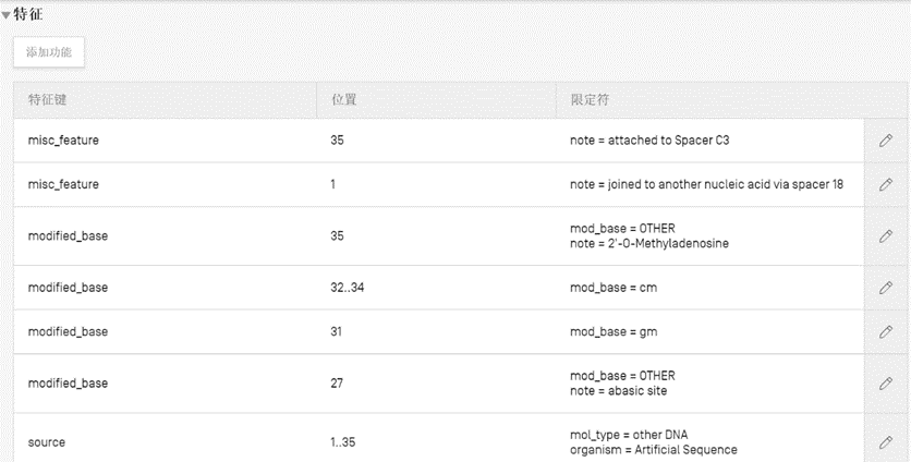 (1)注解第1位碱基T,其连接至Spacer18,在“特征”下点击“添加功能”,在“特征键”中选择“misc_feature”,在右侧“特征位置”中选1,在“限定符”下面选择“限定符名称”为“note”,右侧的“限定符值”输入“joined to another nucleic acid via spacer 18” 或“attached to Spacer 18,which is joined to another nucleic acid”;