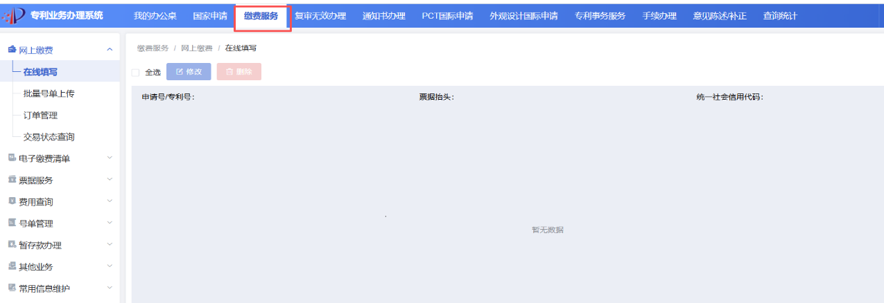 使用原缴费账号登录国家知识产权局“专利业务办理系统”,进入“专利缴费服务”-- “票据服务”--“其他票据业务”。