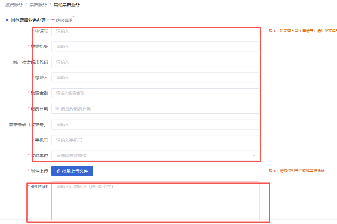 按照原始票据信息,填写申请号、票据抬头、缴费人、缴费金额、缴费日期(注意是缴费支付日期)、手机号、收款单位等。业务描述部分可简要复制证明文件中的修改事由,并清晰列出正确的抬头信息。